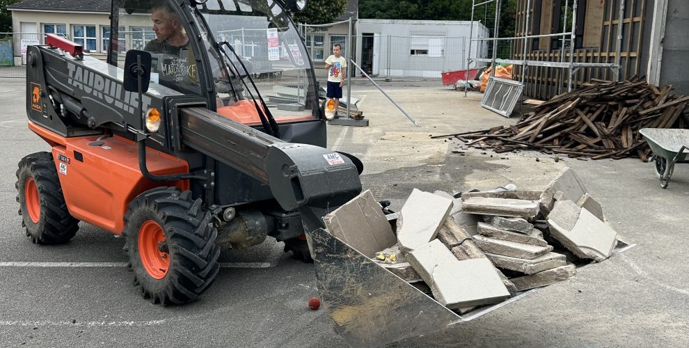 Retour en images de l’avancée des travaux de rénovation de l’école. JUIN 2025 Samedi 14 juin, matinée « démolition de la dalle » par une équipe dynamique de parents bénévoles accompagnée de Laurent Goupil. Retour en images : Au même moment, les ouvriers continuent de travailler :
