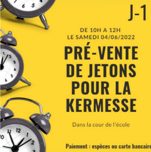 Nous vous rappelons que samedi 4 juin, entre 10h et 12h, une prévente de jetons se tiendra à l’école.